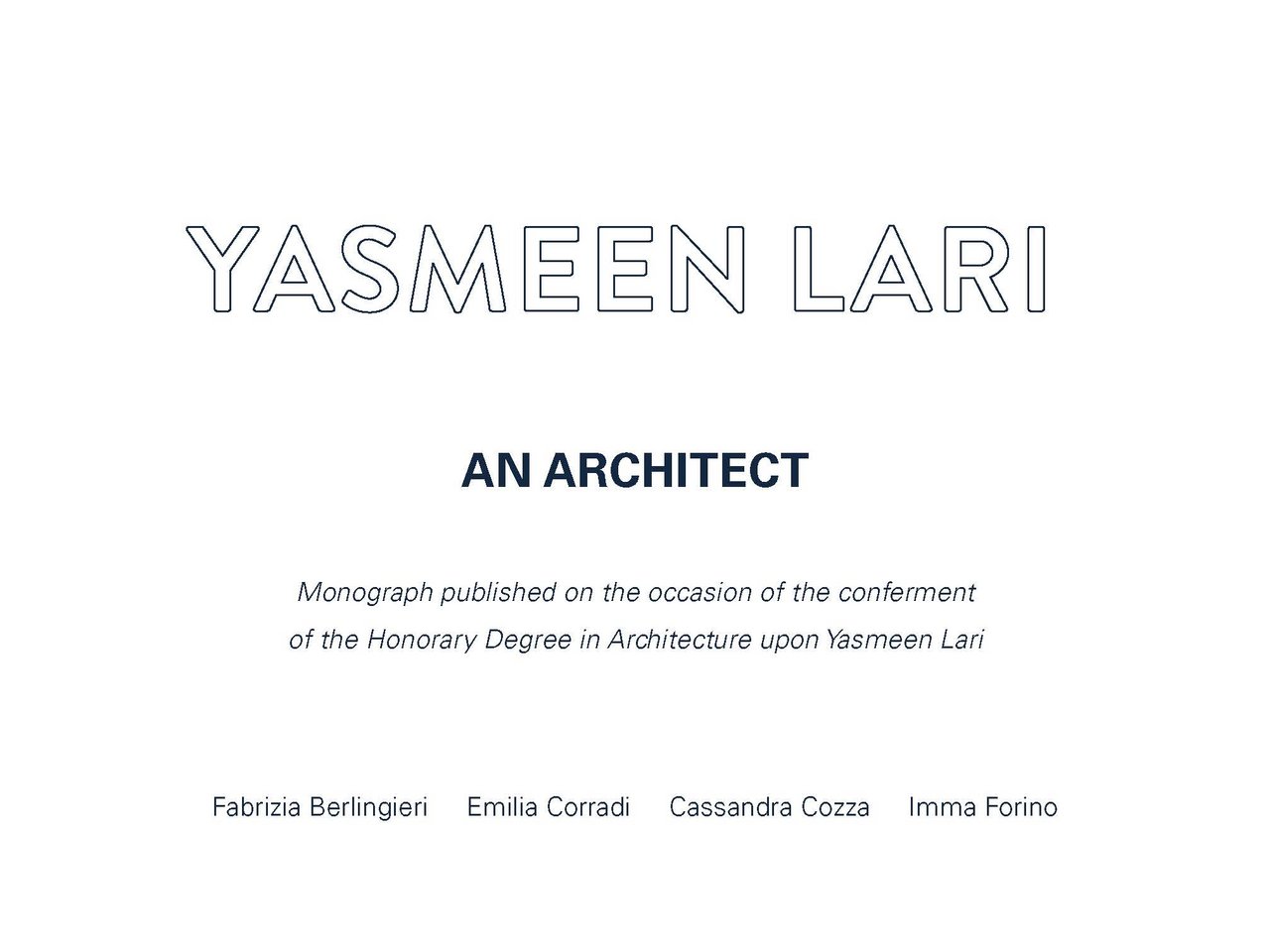 La monografia Yasmeen Lari. An architect nasce in occasione del conferimento della Laurea Magistrale ad honorem in Architettura e Ingegneria Edile-Architettura da parte della Scuola AUIC Architettura, Urbanistica, Ingegneria e Costruzioni del Politecnico di Milano.