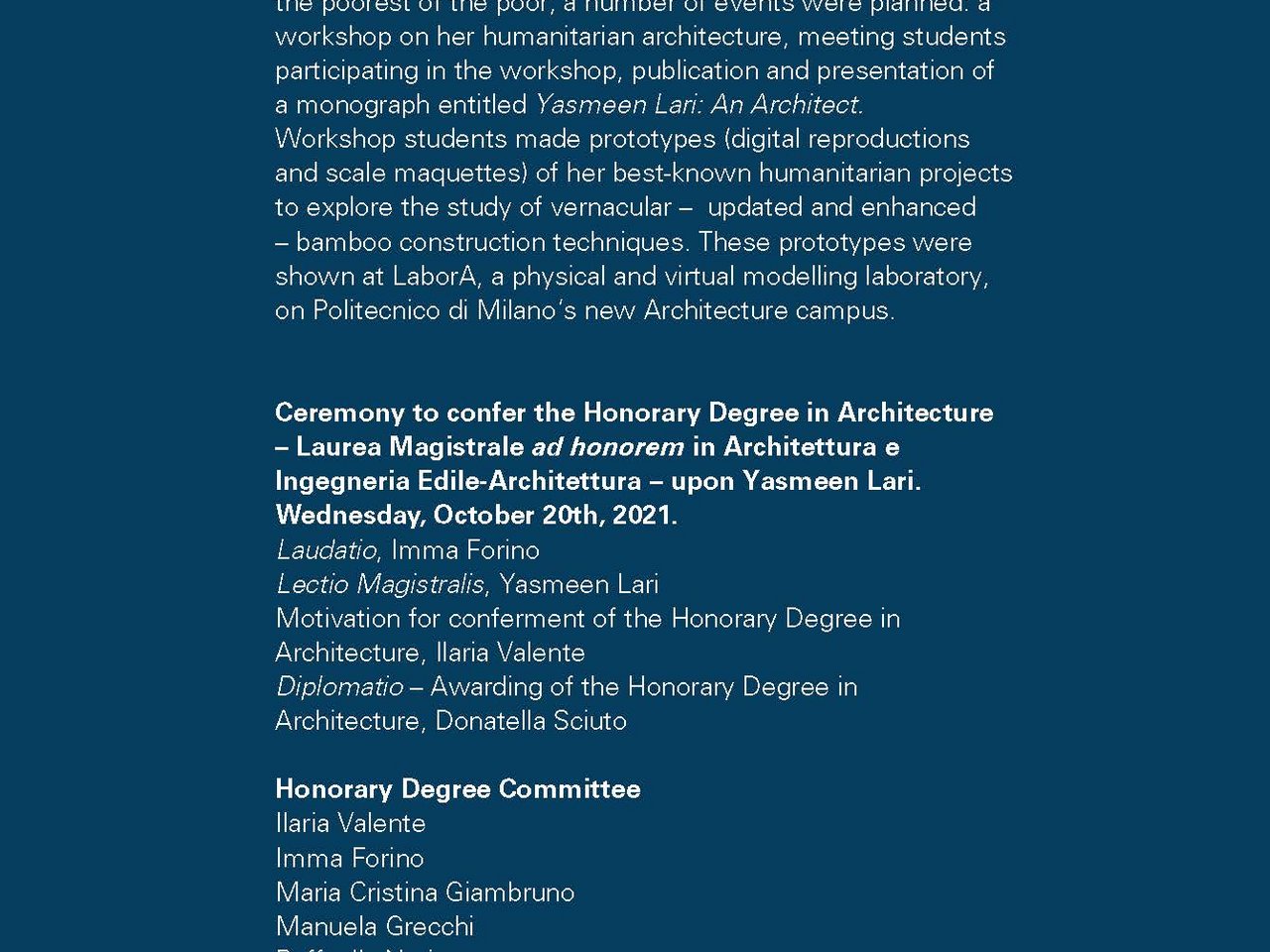 In occasione della cerimonia di conferimento della Laurea Magistrale ad honorem in Architettura e Ingegneria Edile-Architettura all’architetta pachistana Yasmeen Lari – che ha dedicato la sua vita ai diritti dei più indigenti e alla sostenibilità ambientale – la Scuola AUIC del Politecnico di Milano ha organizzato una serie di eventi: un workshop sulle sue architetture umanitarie, un incontro con gli studenti che hanno partecipato al workshop e la mostra dei modelli fisici e digitali prodotti durante lo stesso, la redazione e la presentazione di una monografia intitolata Yasmeen Lari. An Architect.